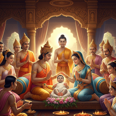 A tradição budista conta que, ao nascer, Siddhartha deu sete passos e declarou: "Eu nasci para trazer a paz ao mundo!" Profecias indicavam que ele seria um grande líder, ou um grande rei, ou um grande iluminado. O rei Shuddhodana, temendo a perda de seu filho para a vida monástica, tentou protegê-lo das realidades da vida, isolando-o em um mundo de prazeres e conforto.