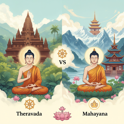 Theravada: Conhecido como " a escola dos anciãos ", o Theravada é considerado a forma mais antiga de Budismo. Enfatiza a prática da meditação, a busca individual pela iluminação e o estudo das escrituras budistas em páli ( Pali Canon ). É predominante no Sri Lanka, Tailândia, Myanmar, Camboja e Laos.