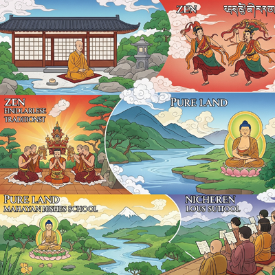 Zen Budismo: Uma escola Mahayana que se desenvolveu na China ( Chan ) e no Japão ( Zen ), enfatizando a prática da meditação ( zazen ) e a busca pela iluminação através da experiência direta, além da simplicidade, a disciplina e a importância do aqui e agora.